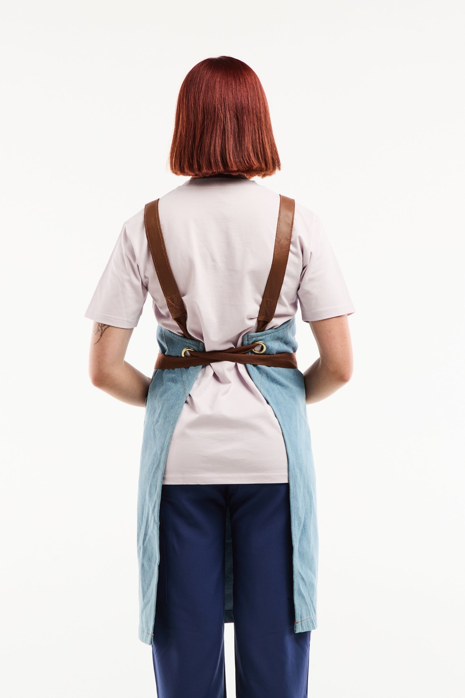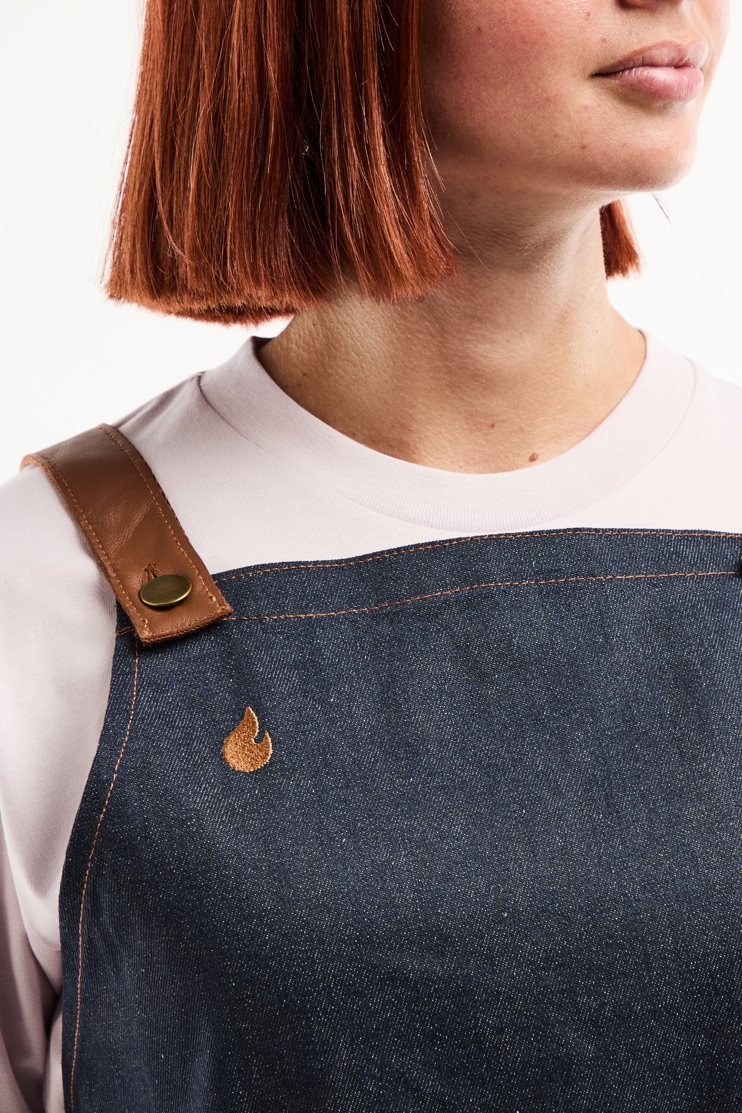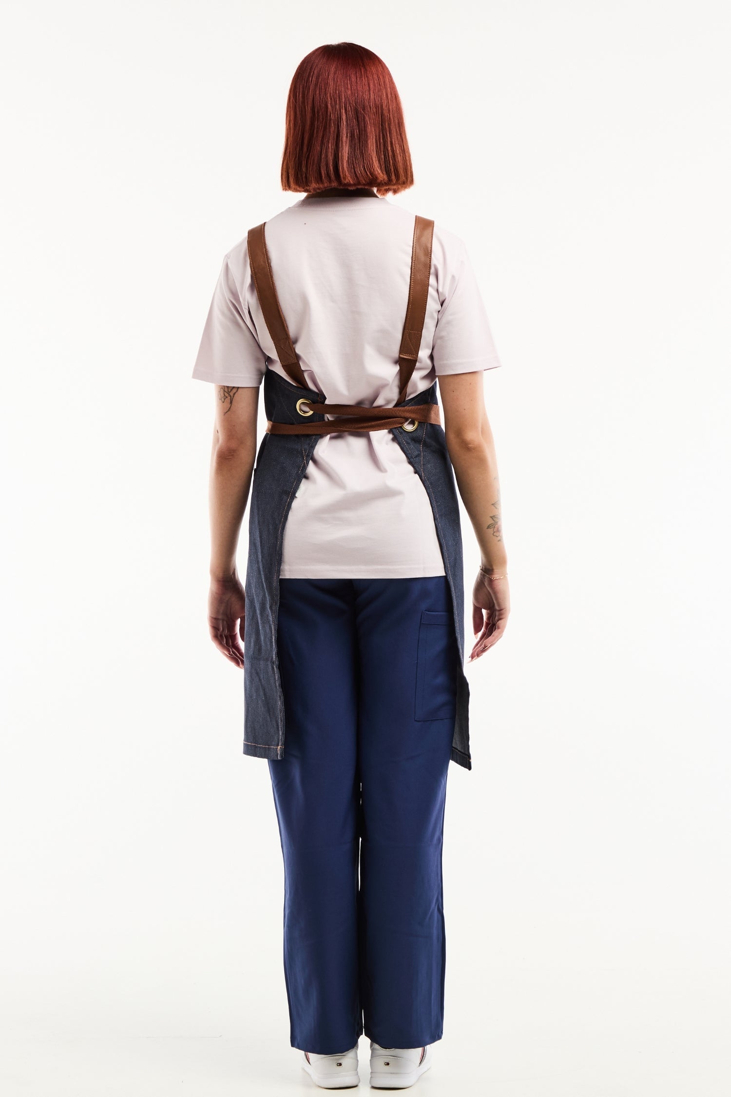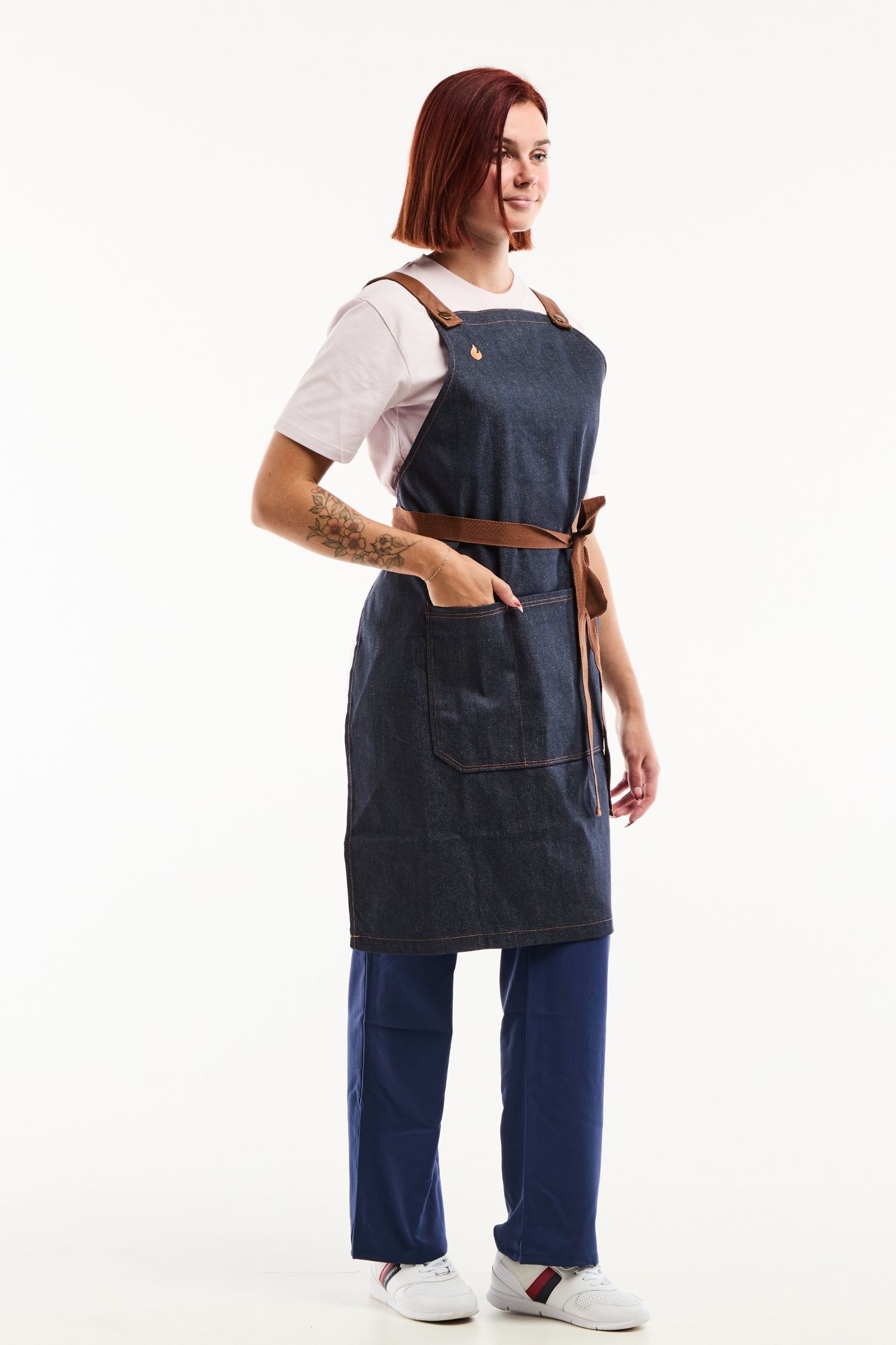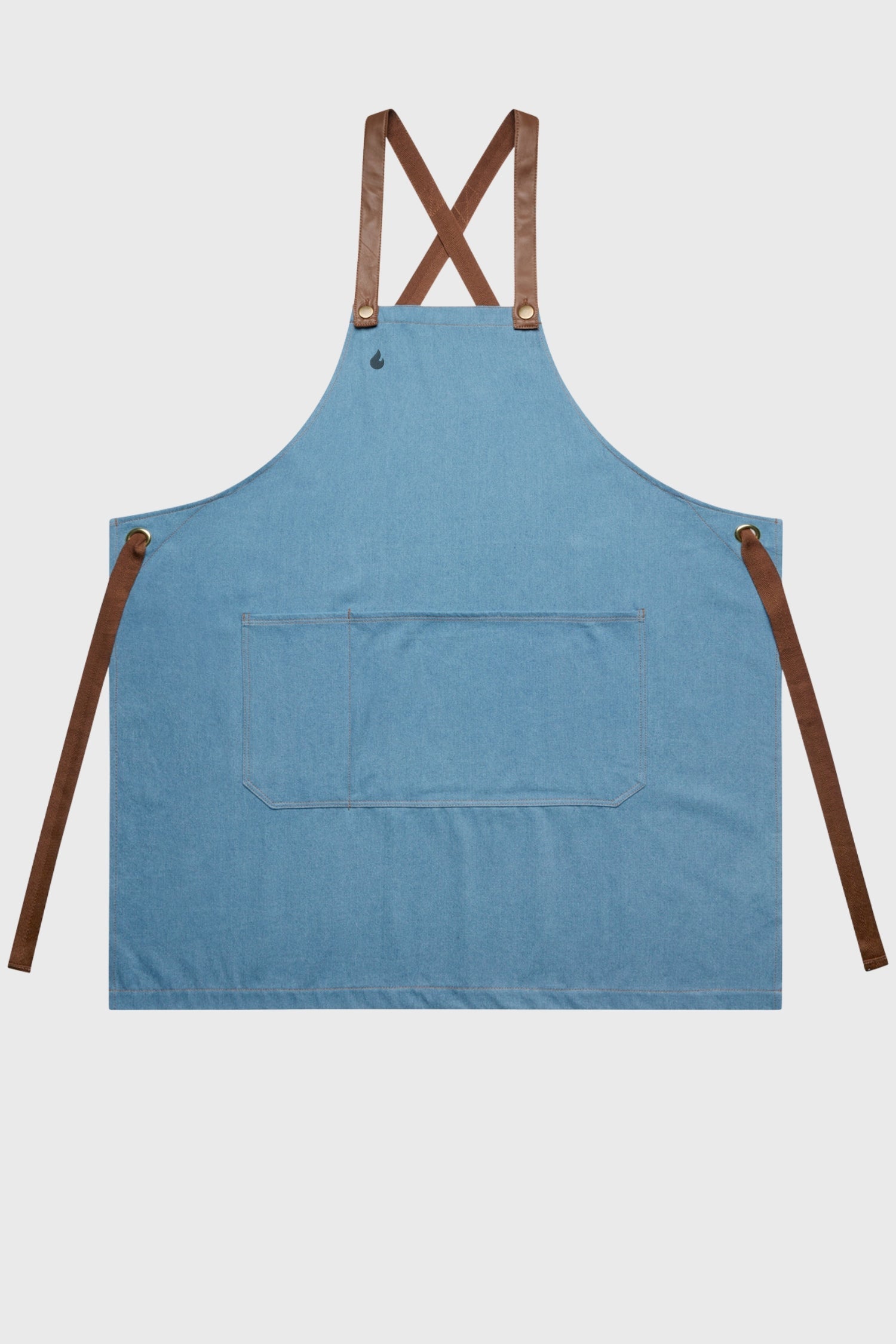 Der Kontrast zwischen rohem Denim und Lederdetails schafft eine moderne, anspruchsvolle Ästhetik. Die Schürze bleibt flexibel und schützt zuverlässig vor Hitze und Spritzern. Jede Naht, jede Öse und jeder Riemen ist auf Langlebigkeit ausgelegt – professionelles Design im Dienst von Komfort und Stil.