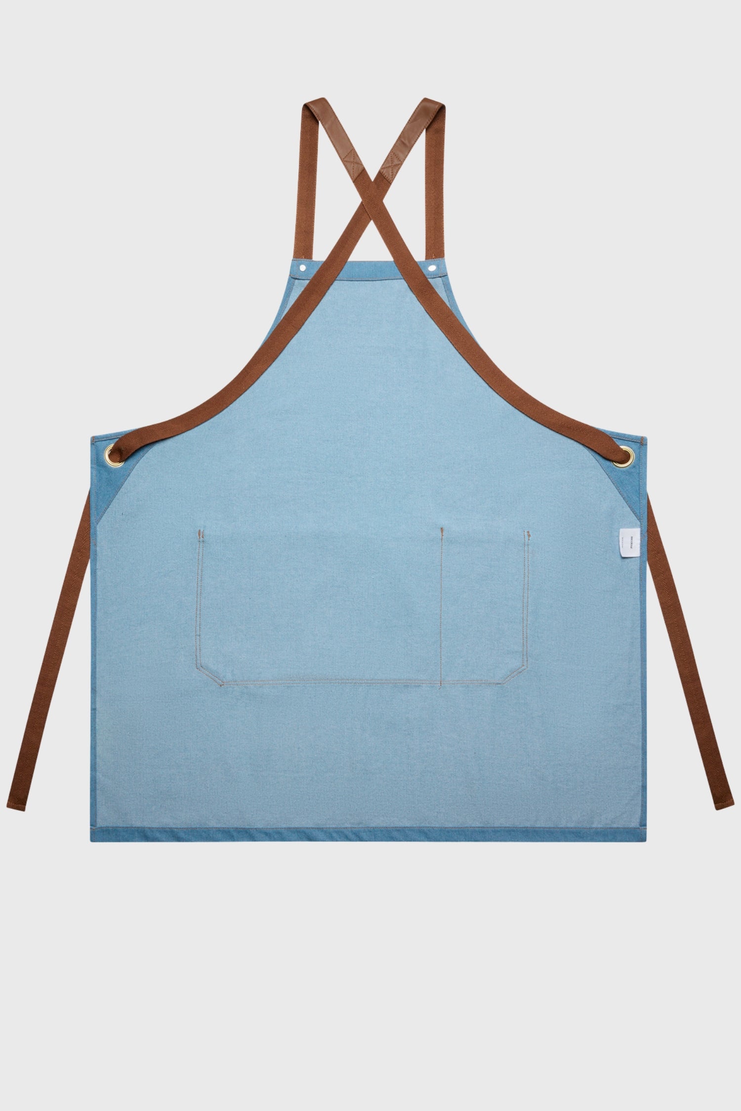 Le contraste entre la toile denim brute et les détails en cuir crée une esthétique raffinée et contemporaine. Le tablier conserve sa souplesse tout en protégeant efficacement contre la chaleur et les éclaboussures. Chaque surpiqûre, chaque œillet, chaque sangle a été pensé pour durer — un design professionnel au service du confort et du style.